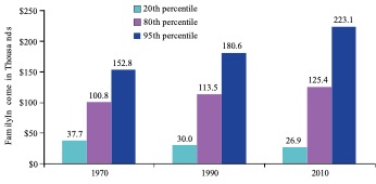Compared with 1970, the 2010 family income at the 20th percentile of income has fallen by more than 25 percent to about $27,000. In contrast, the incomes of families at the 80th percentile grew by 23 percent, to $125,000, and the incomes of the richest 5 percent of families rose even more. These growing income gaps translated into increased gaps between the academic achievement and educational attainments of children from high- and low- income families.